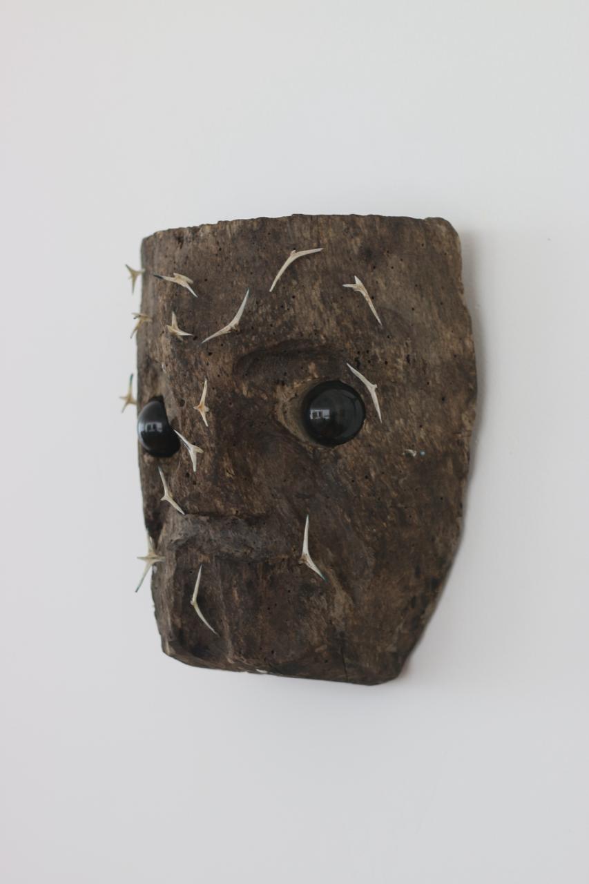 Mask Chuyachaki 2, 2023 Unfinished carved avocado wood mask, obsidian and sacrificial fish bones 20 x 23 x 12 cm