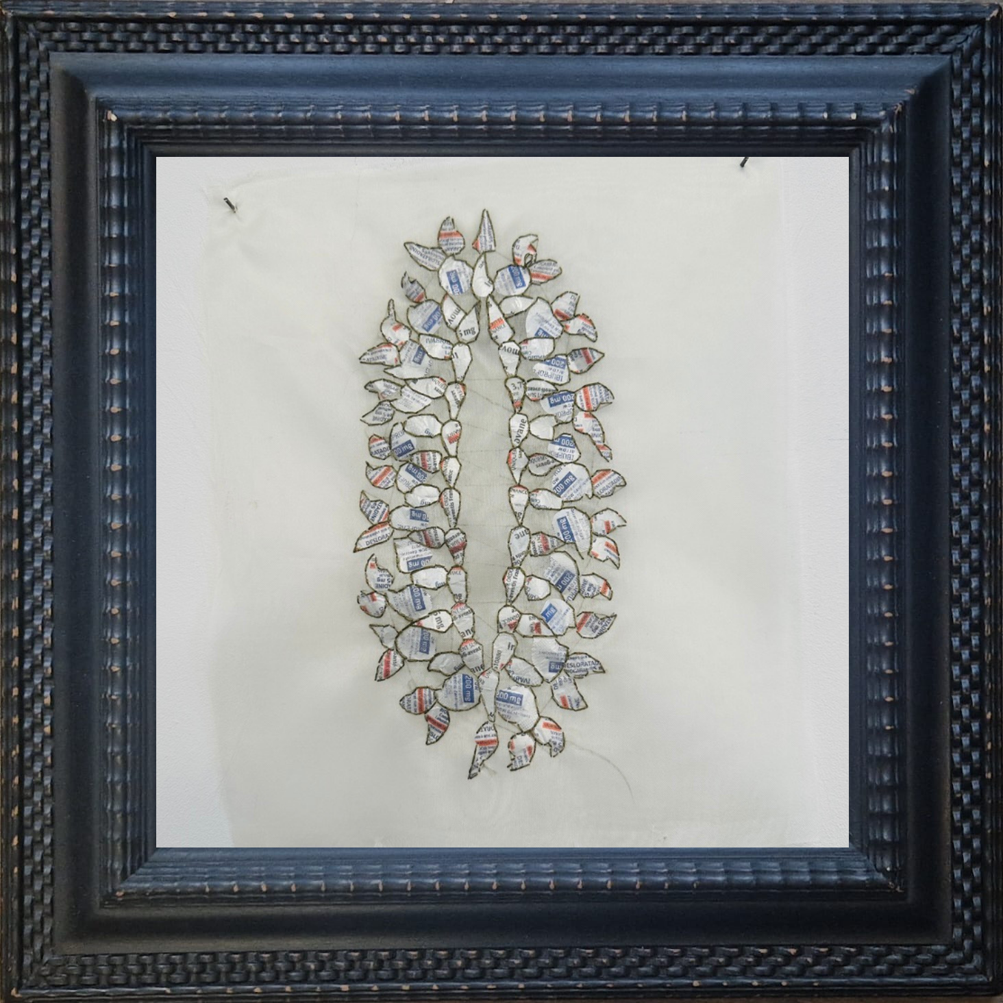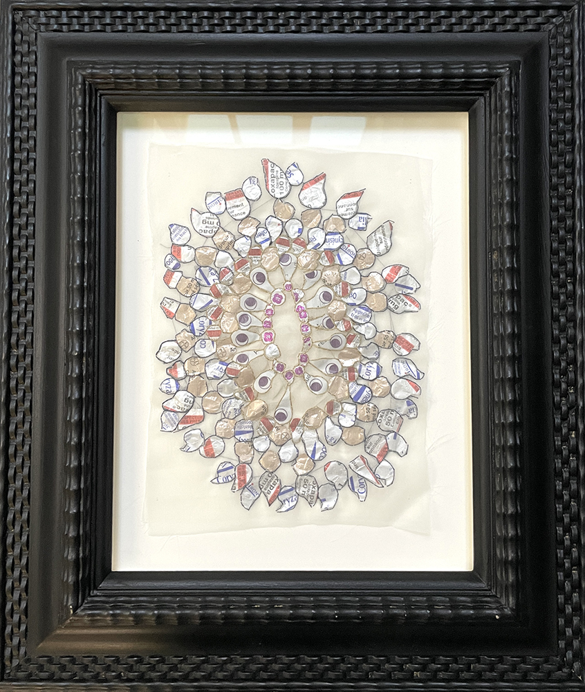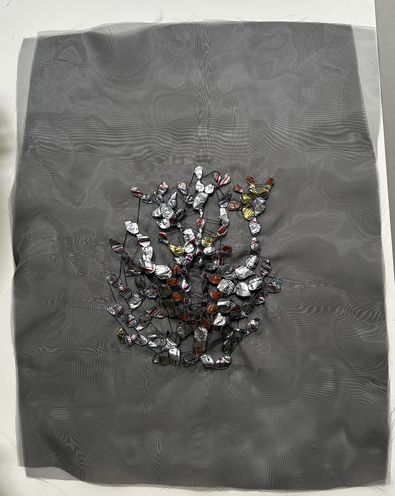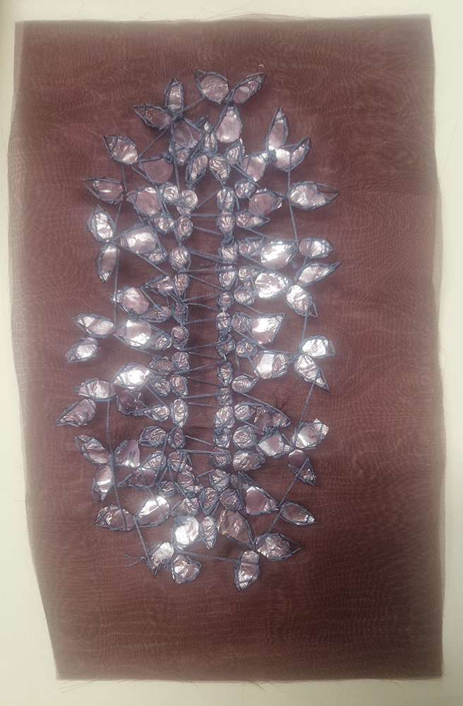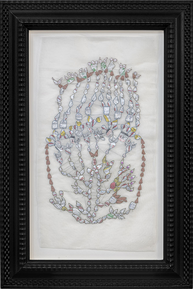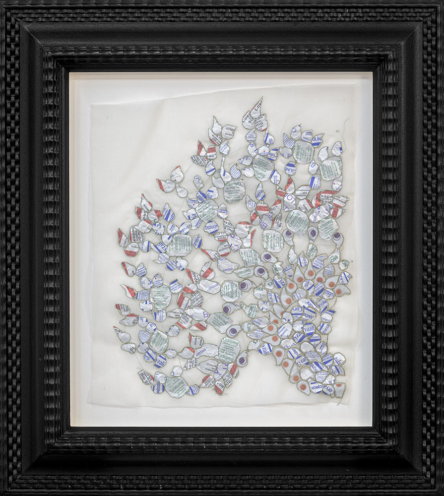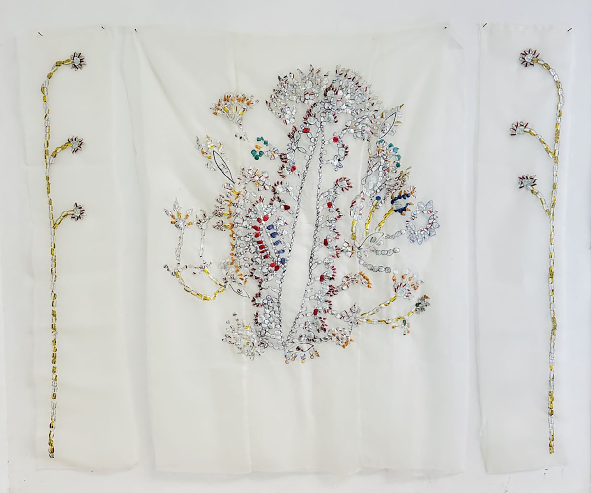 fragments of empty plastic bottles, glass painting, blister pack, recycled glass beads, staples, cotton thread.
