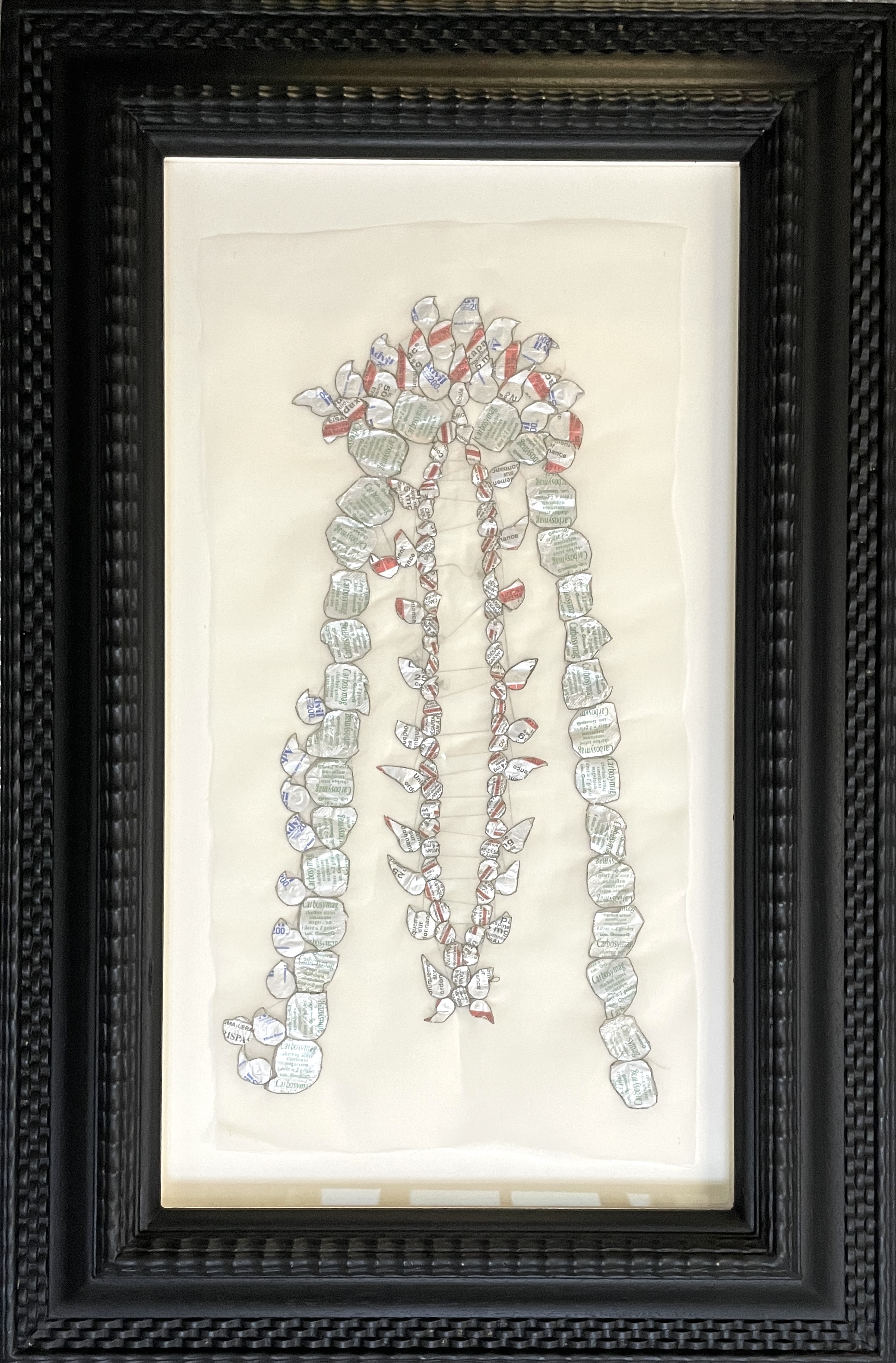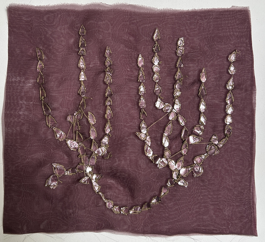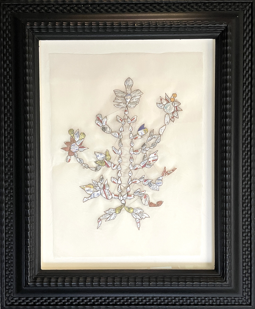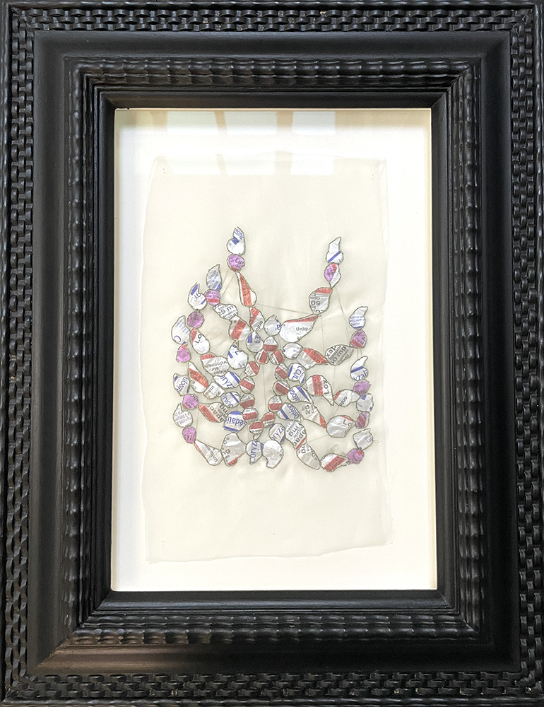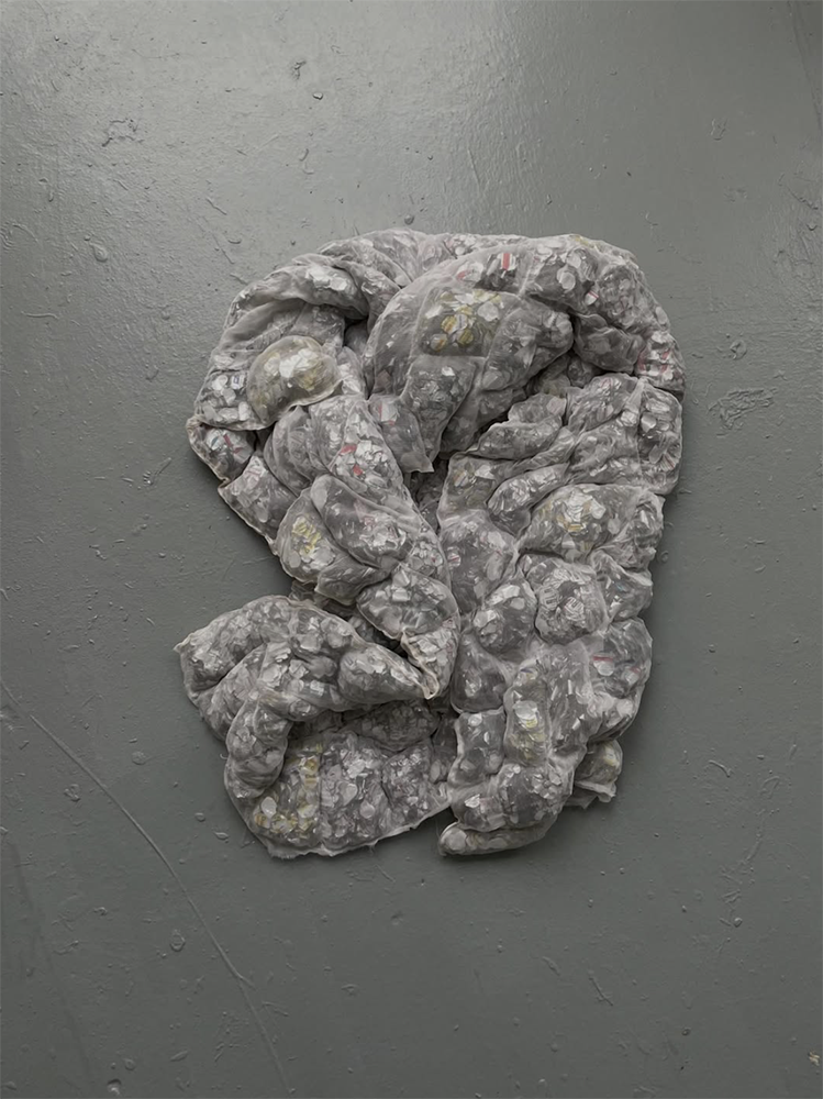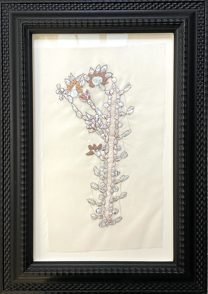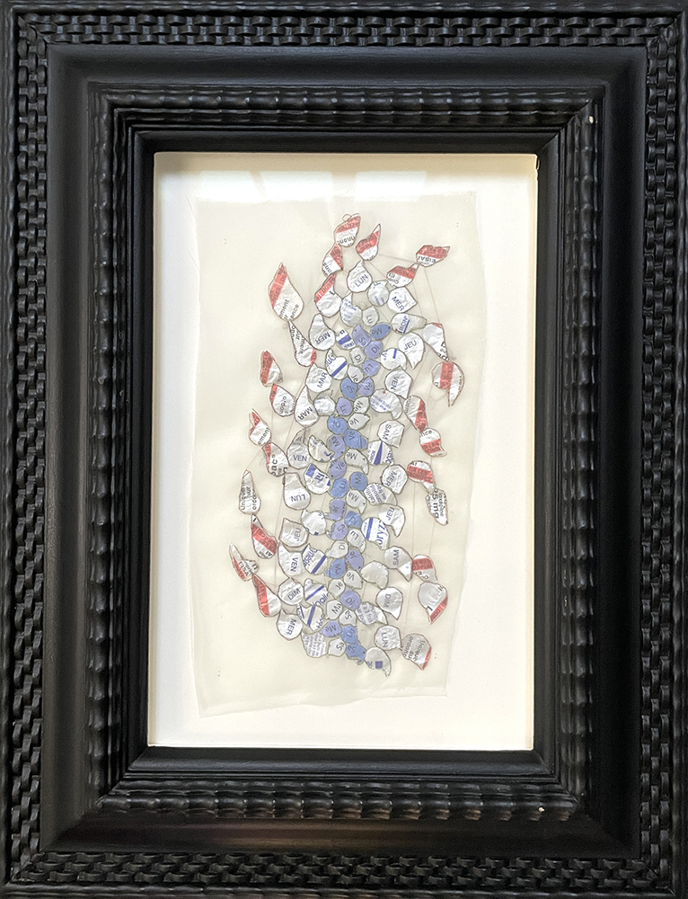 fragments of empty plastic bottles, glass painting, blister pack, recycled glass beads, staples, cotton thread.