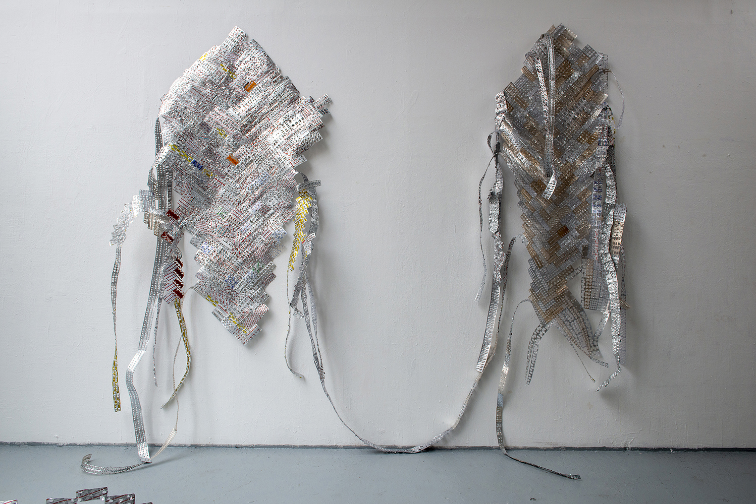 fragments of empty plastic bottles, kitchen foil, glass painting, staples.
