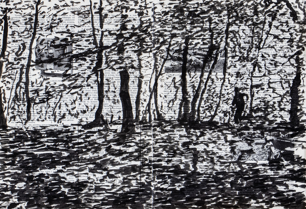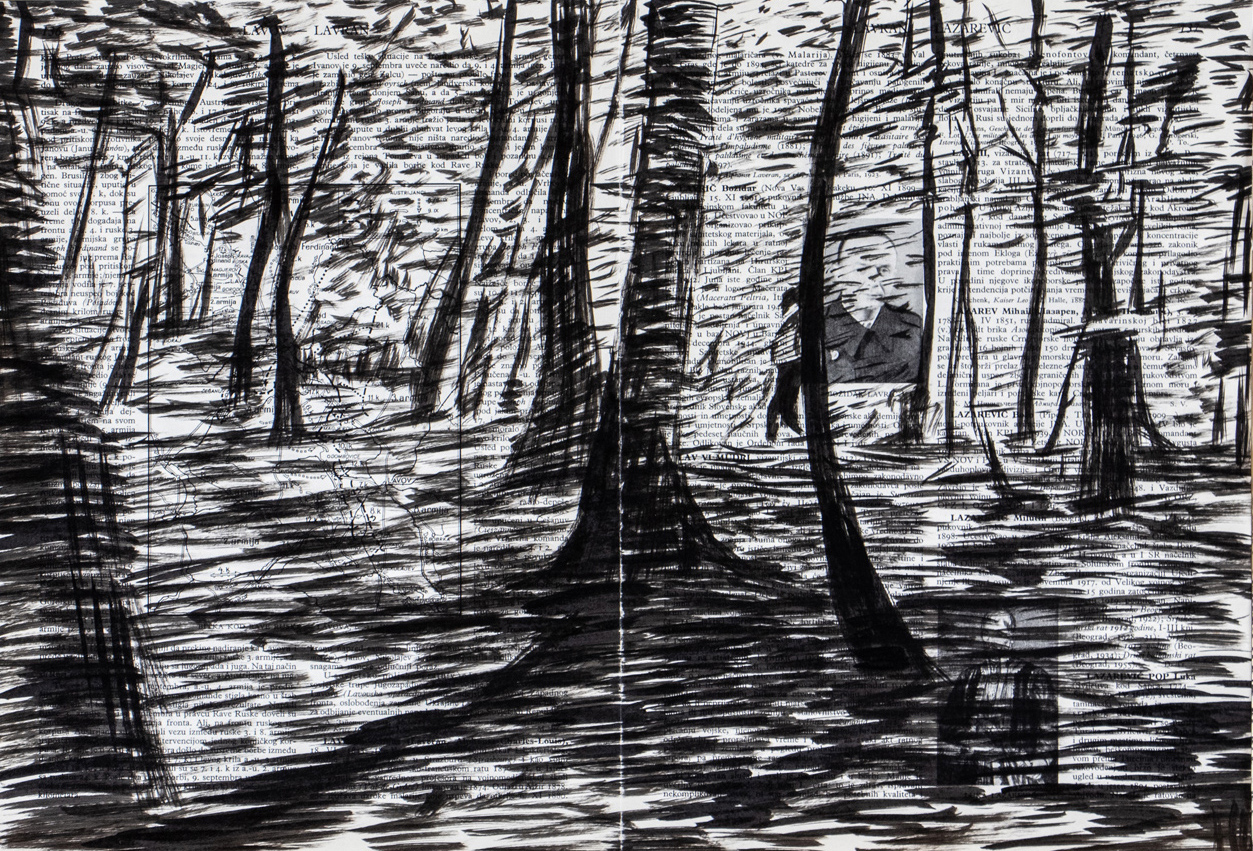 Panic Book - sequence #20, 2013 - 2015 serie Panic Book encre et fusain sur pages de livre 83 dessins ( 24x31 cm chaque )