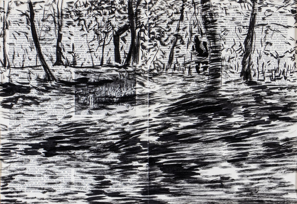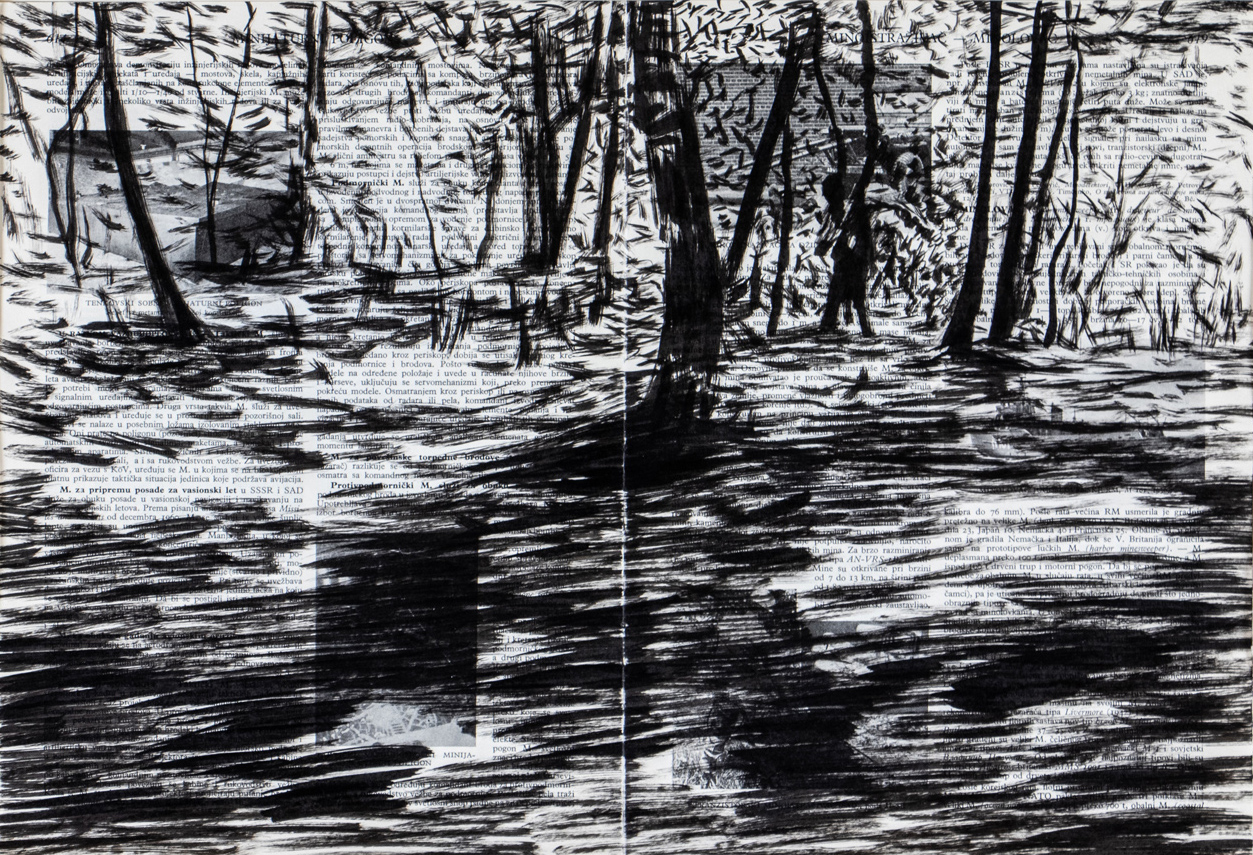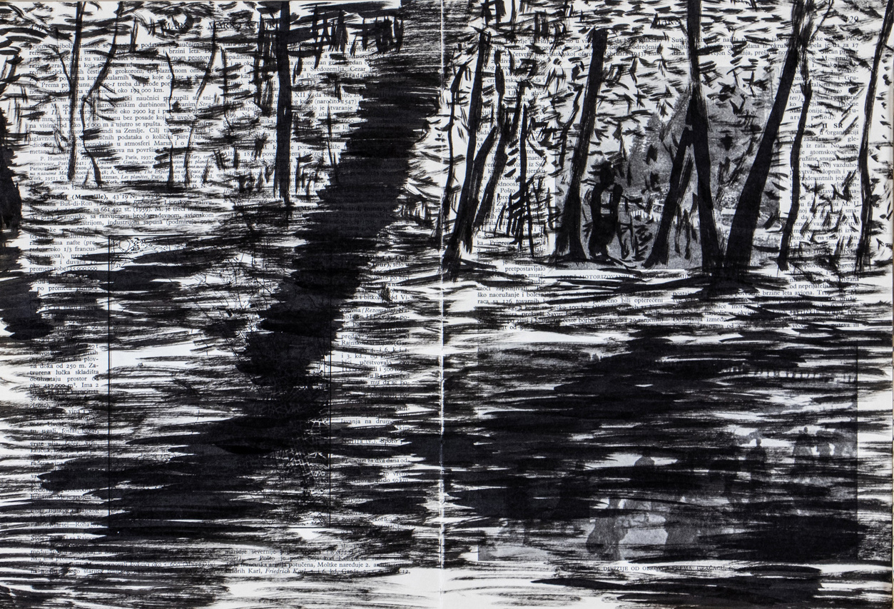 Panic Book - sequence #11, 2013 - 2015 série Panic Book encre et fusain sur pages de livre 15 dessins ( 33,5 x 23,5 cm chacun )