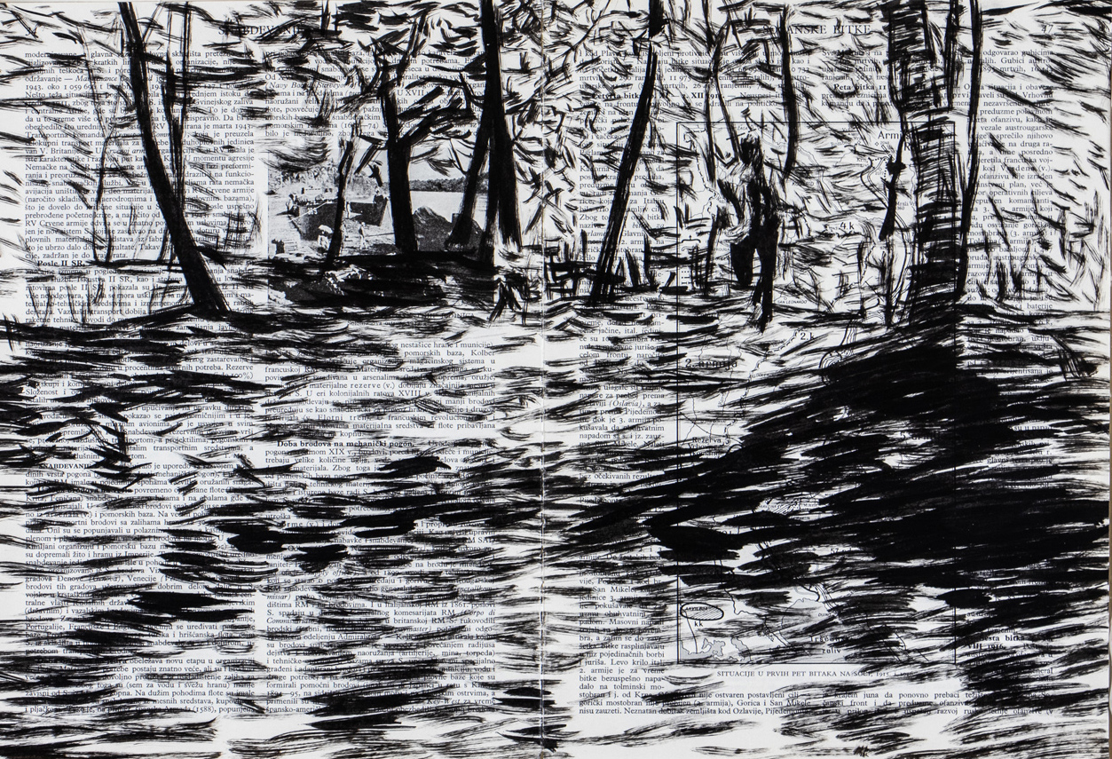Sequence #14, 2013 - 2015 serie Panic Book fusain sur pages de livre 23 dessins (24x31 cm chaque)