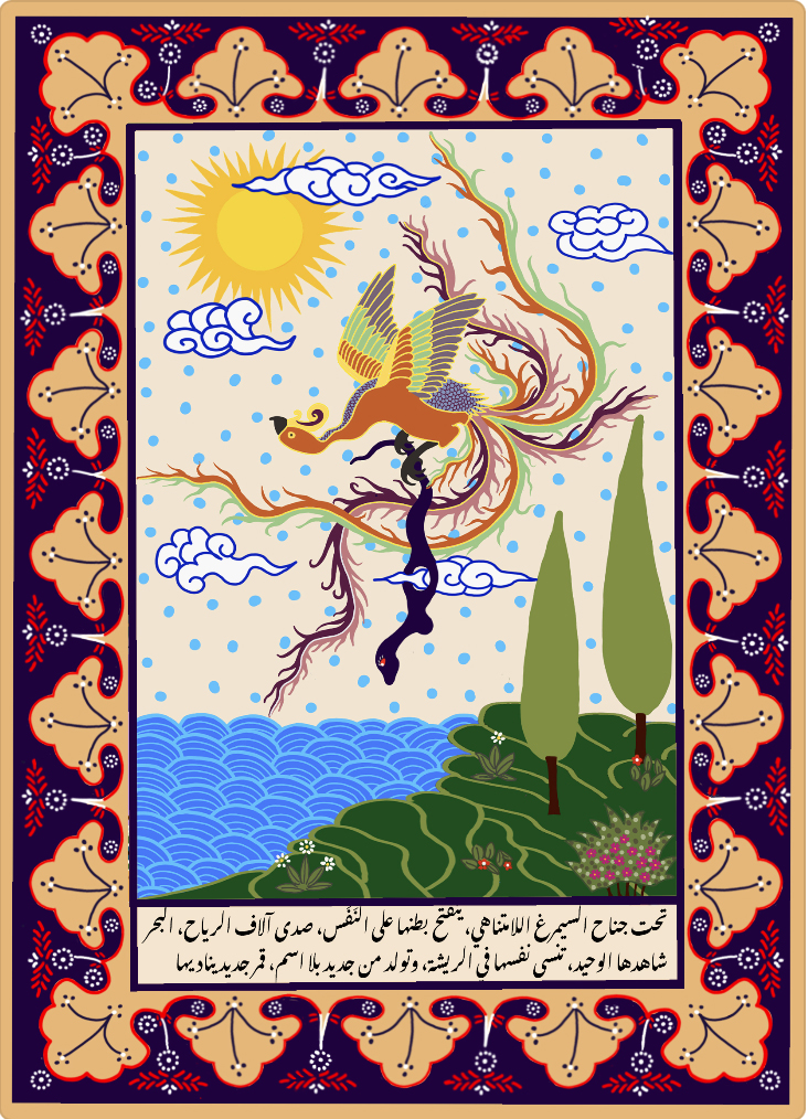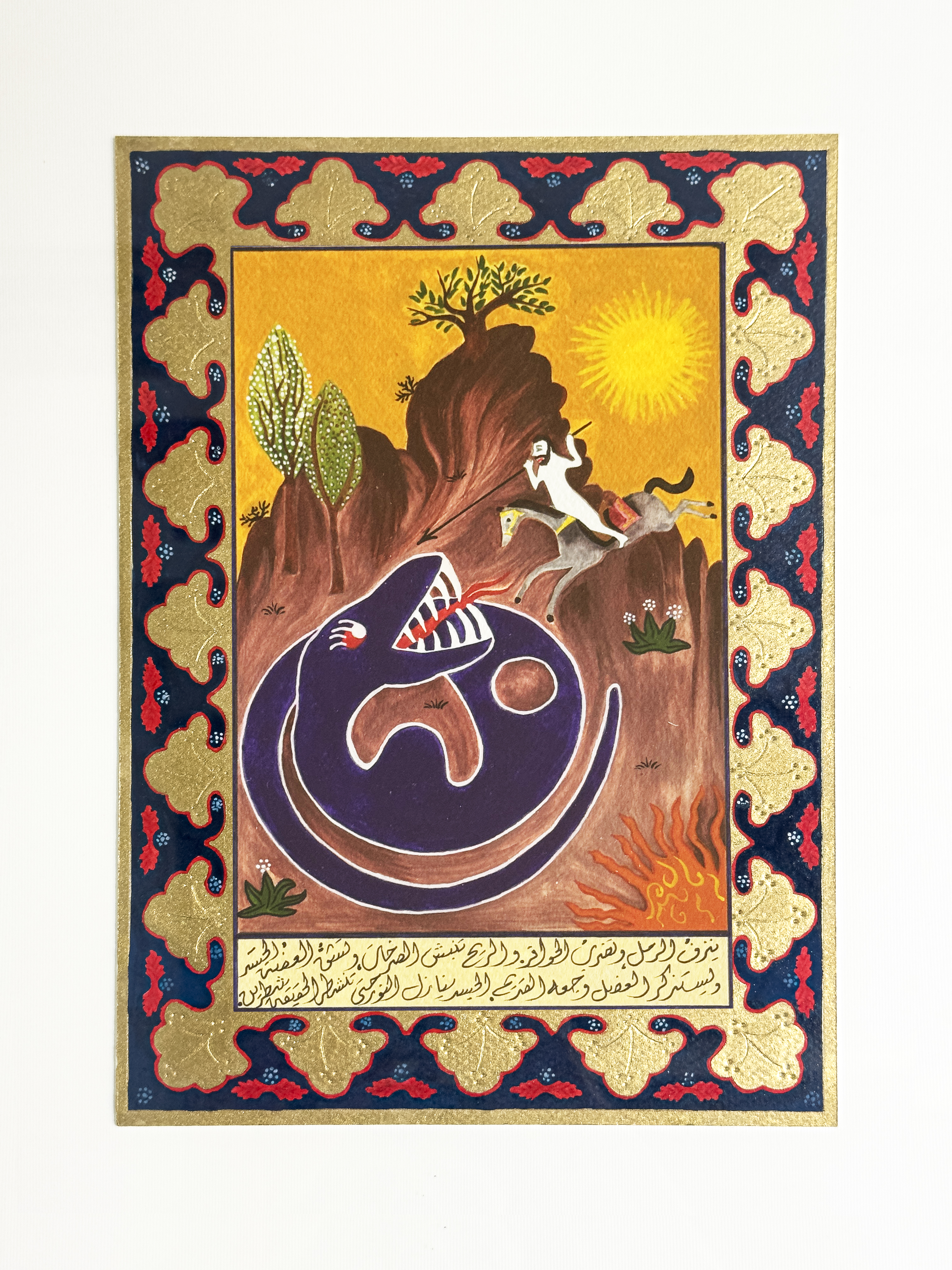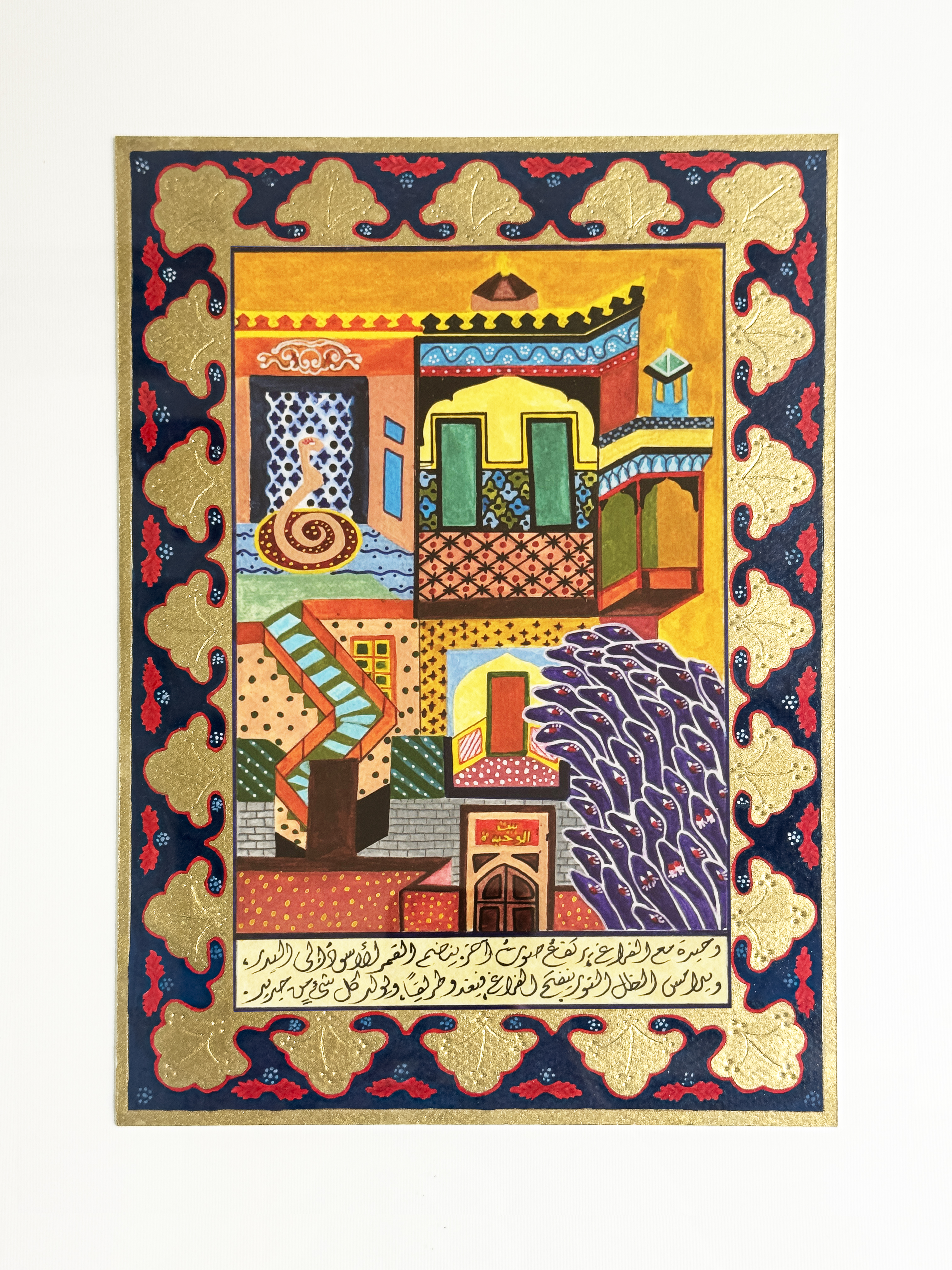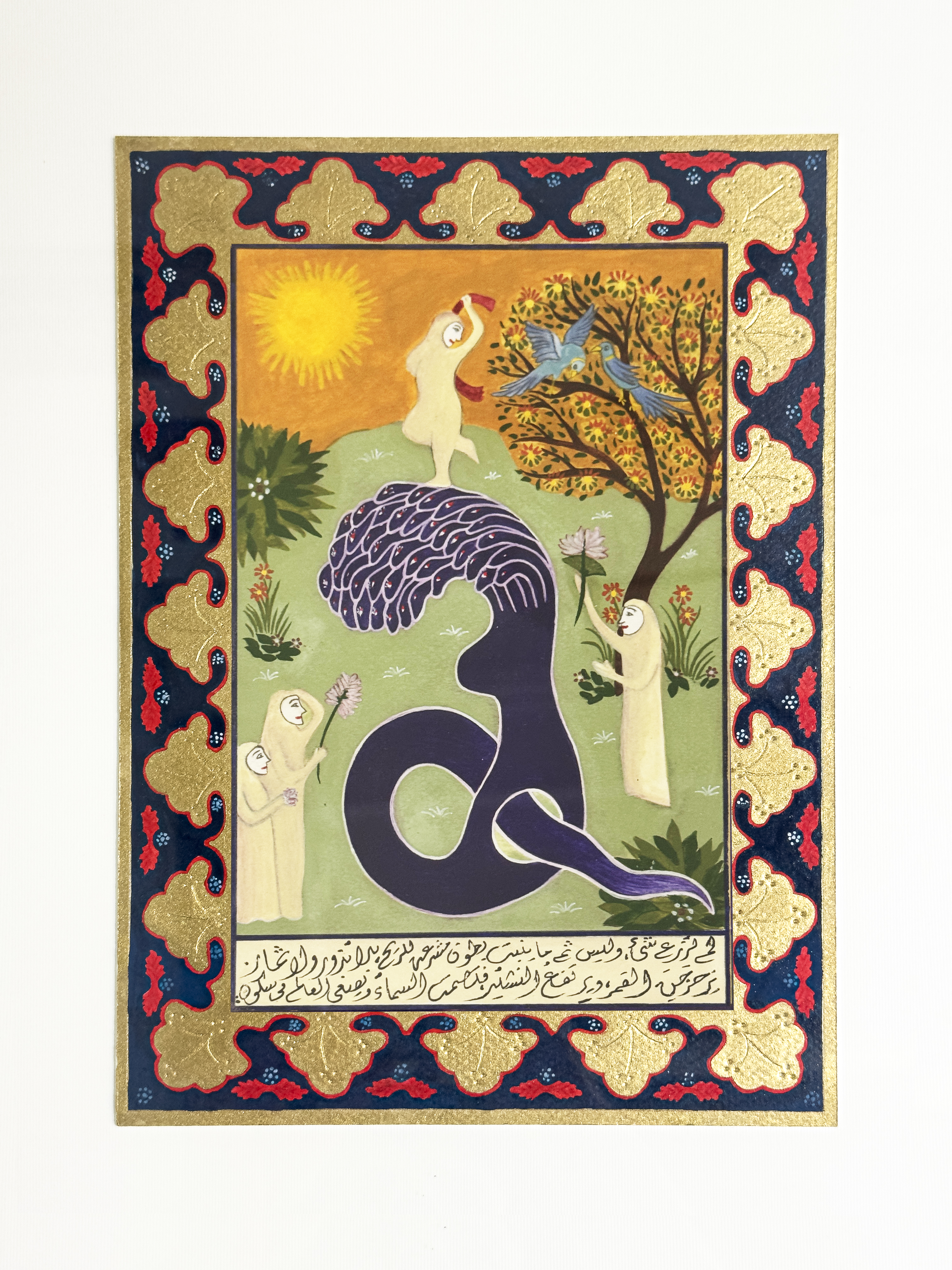 Chapitre 7 - The Simurgh's Embrace - the Book, 2025 serie Hayat al-Hayat Pigments et gomme arabique sur papier, feuille d'or, encre de calligraphie 20 x 28,5 cm + cadre