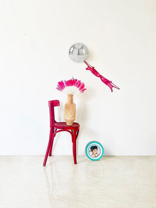 you must shine everywhere you go, 2022 Femme des années 80 céramique, tissu, bois, miroir, plume, métal